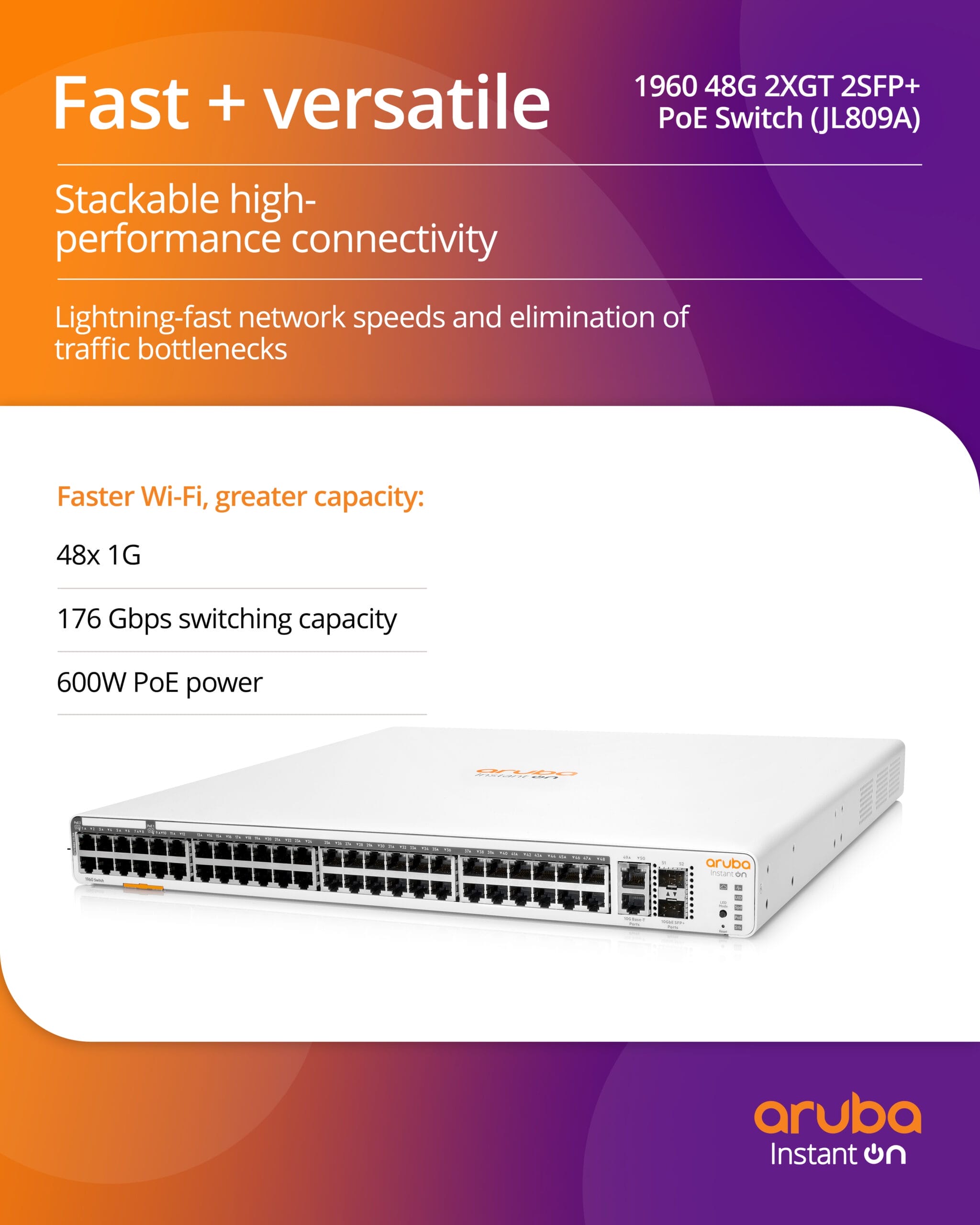 HPE Networking Instant On Switch Series 1960 48-Port Gb Smart-managed Layer 2+ Ethernet Switch with PoE | 48x 1G | 2x 10GBase-T, 2x SFP+ | 40x CL4, 8x CL6 PoE 600W | Stackable | US Cord (JL809A#ABA)