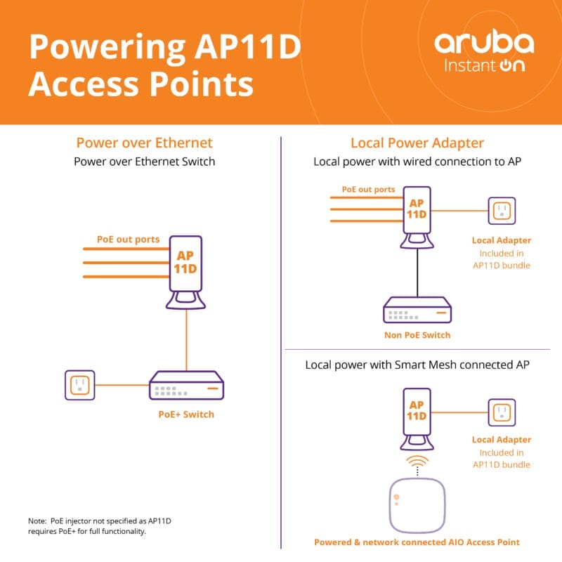 - Powering: AP11D APs require Power over Ethernet (802.3at Class 4 PoE+) or Aruba’s specific 48V power adapter. 802.3af PoE alone is not sufficient for full functionality, notably PoE-out on downlink ports. There are two ordering options based on your chosen power approach. This model (R2X15A) is just the unit, only recommended if you plan to attach to a PoE+ capable Ethernet switch. Also available is a power bundle (R3J25A) that ships with Aruba’s 48V power adapter and cord.