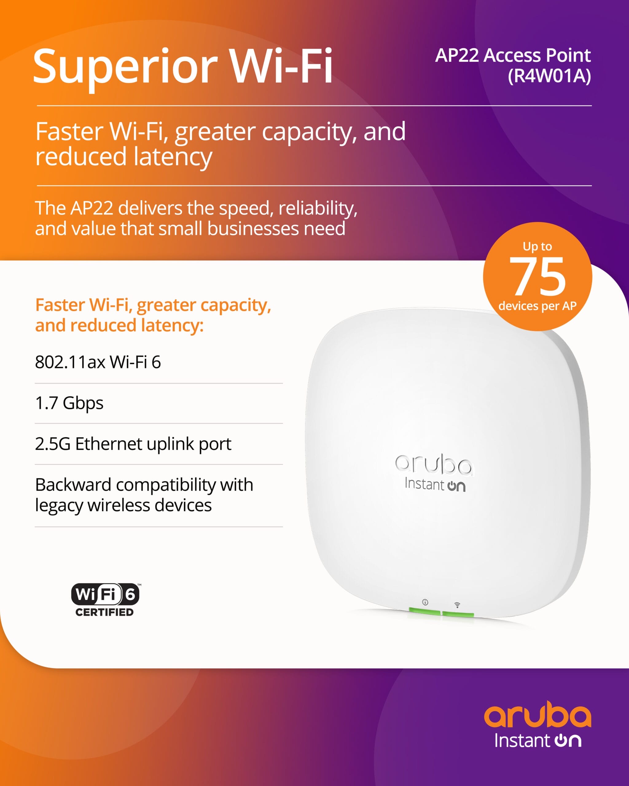 - WI-FI CERTIFIED 6™ (WI-FI 6): AP22 is a Wi-Fi Certified 6™ access point that delivers high-performance, capacity, and efficiency to small and growing business