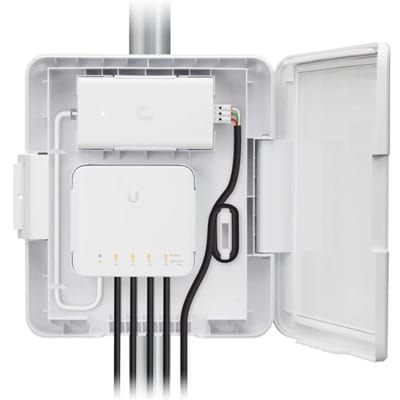 It includes an Ethernet patch cable and a 60W PoE adapter, which provides a maximum PoE budget of 46W. The USW Flex Utility can be easily mounted on a pole, provides clean cable management and screw lock for security.